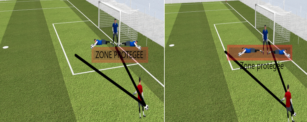 – Ils perdent totalement un côté d’intervention, car leur plongeon finira en dehors du terrain côté ligne de sortie de but.